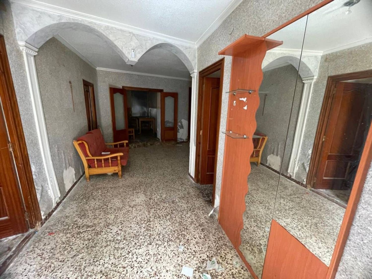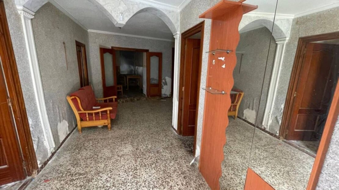 Tiene una superficie de 114 m2, distribuidos en 2 plantas. En planta baja cuenta con 3 dormitorios, salón-comedor, cocina, patio y un baño. La primera planta está diáfana tipo cámara. La vivienda dispone de suelo de terrazo, puertas de sapelly y ventanas de aluminio.
